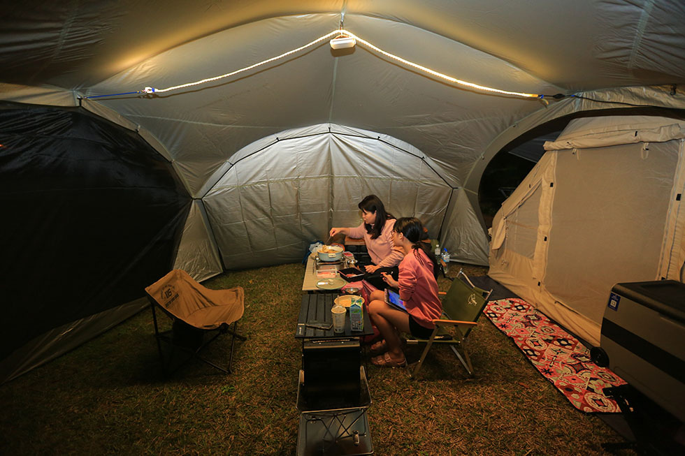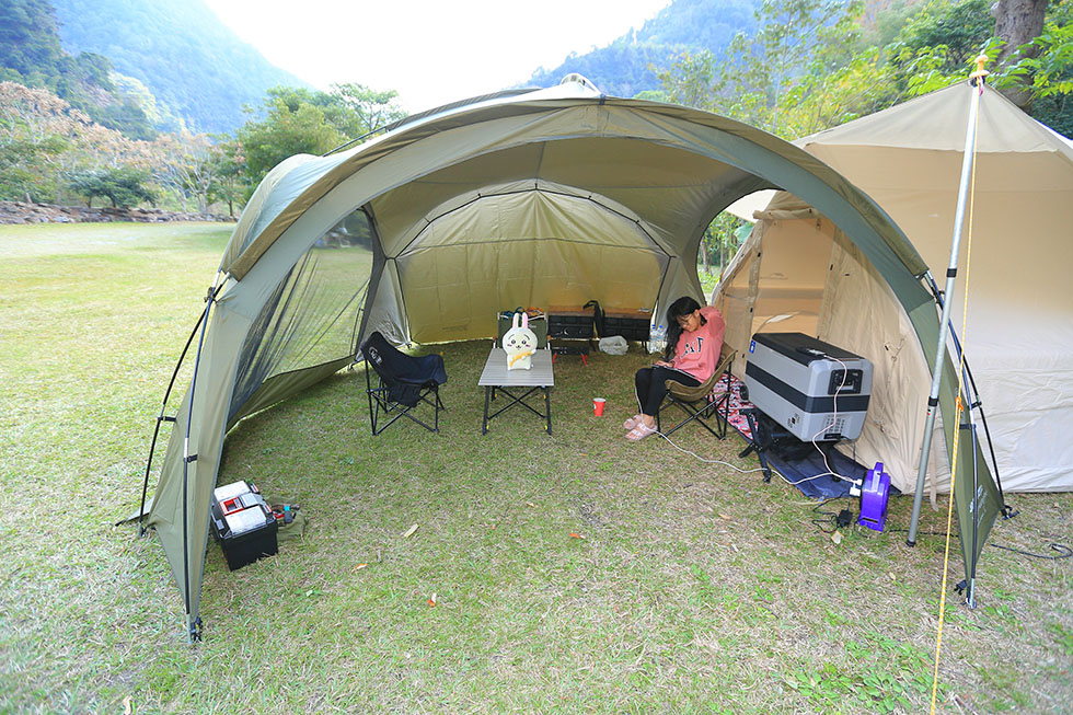 晚餐時間 . 很久沒有使用客廳帳了 . 4*4米的空間寬敞 . 第一晚氣溫僅約10度上下 . 一邊拉起邊布擋風 . 前方用紗網 .