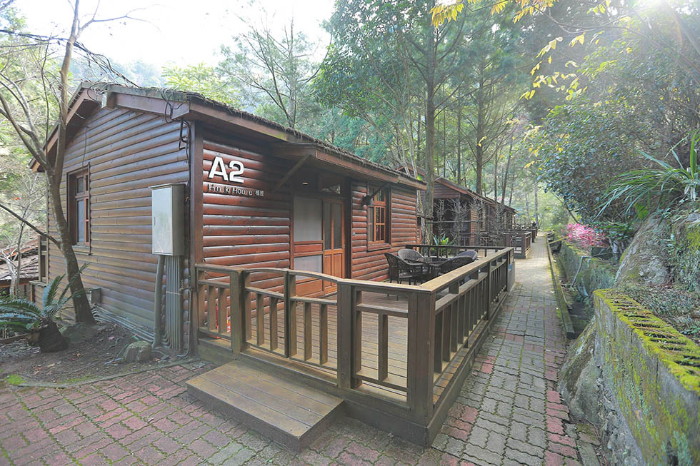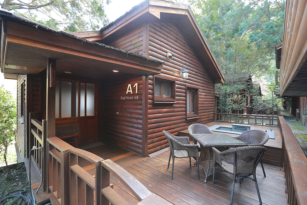 獨棟的木屋區外有桌椅 . 桌椅旁很意外還有泡腳池ㄝ .