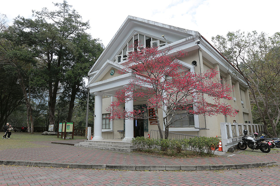 遊客中心大門旁的迎賓櫻花倒到開得不錯 .