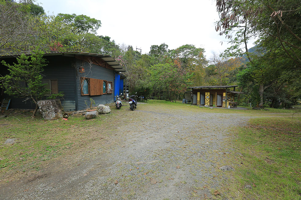 左為營本部 . 右黃色建築物為衛浴設施 . 除了這間衛浴外 . 上層與下層還有2間簡易的化妝室 . 如果嫌衛浴太遠 . 廁所少的人會有怨言 .